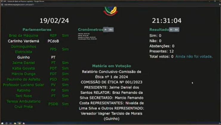 O parecer do relator, Braz da máquina, foi favorável ao afastamento do vereador Guinho (PT) pelo período de 90 dias. Os demais membros da comissão, vereadores Jaime Daniel e Dunga, acompanharam o relator optando pelo afastamento do vereador Guinho (PT).